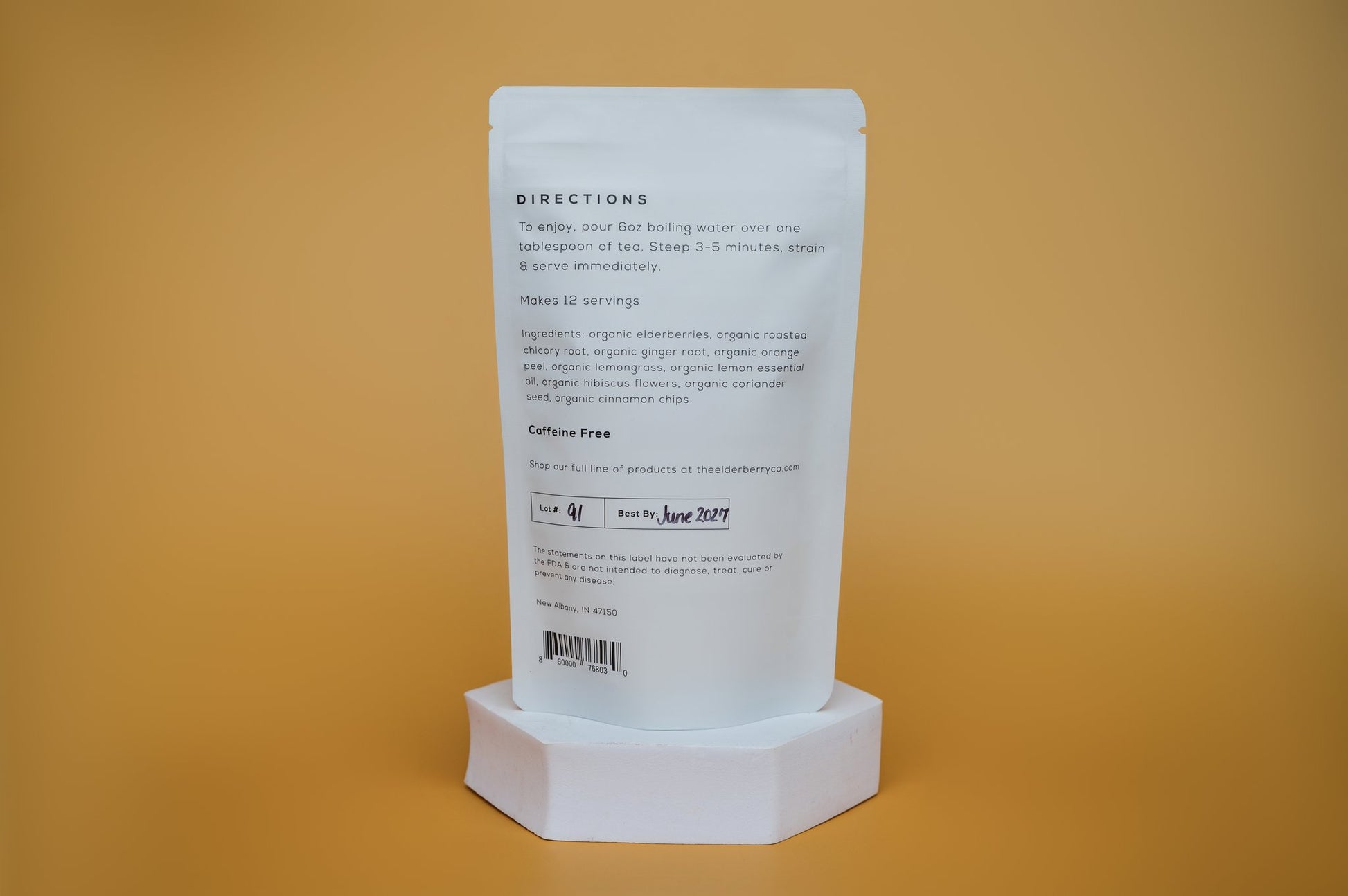 Ingredients: Organic elderberries, organic roasted chicory root, organic ginger root, organic orange peel, organic lemongrass, organic lemon essential oil, organic hibiscus flowers, organic coriander seed, organic cinnamon chips.