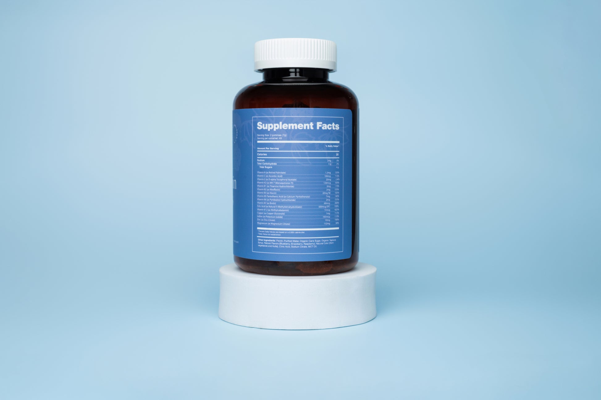 Pectin, Purified Water, Organic Cane Sugar Organic Tapioca Syrup, Natural Flavors (Blueberry, Strawberry, Raspberry), Natural Color (from vegetables and fruits), Citric Acid, Sodium Citrate, MCT Oil
