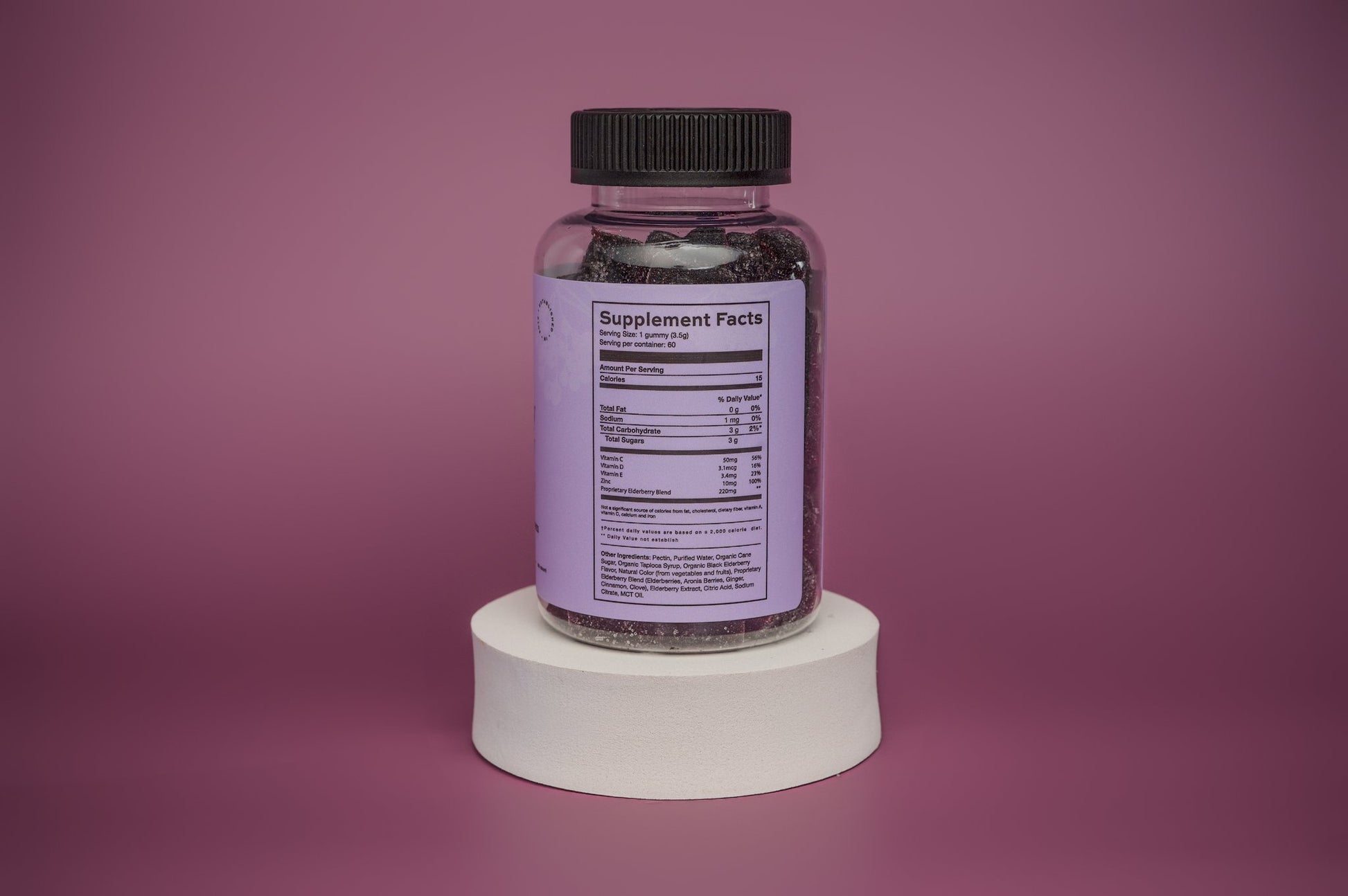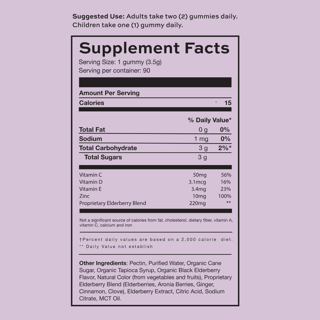 Pectin, Purified Water, Organic Cane Sugar, Organic Tapioca Syrup, Organic Black Elderberry Flavor, Natural Color (from vegetables and fruits), Propriety Elderberry Blend (Elderberries, Aronia Berries, Ginger, Cinnamon, Clove), Elderberry Extract, Citric Acid, Sodium Citrate, MCT Oil.