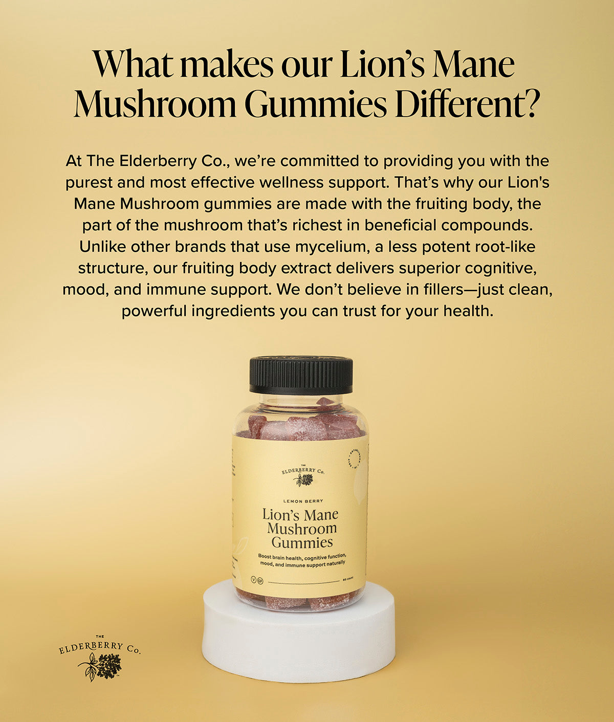 Each gummy delivers 167mg of premium Lion's Mane mushroom extract. Unlike many other gummies that rely on less potent mycelium, ours are made from the fruiting body – the most nutrient-rich and bioactive part of the mushroom, delivering up to 15x more nutritional value. Lion's Mane is a natural superfood renowned for its ability to support mental clarity, focus, and memory. This powerful adaptogen may also promote a positive mood, steady energy levels, and overall immune health, while helping maintain a balanced inflammatory response during physical activity.
