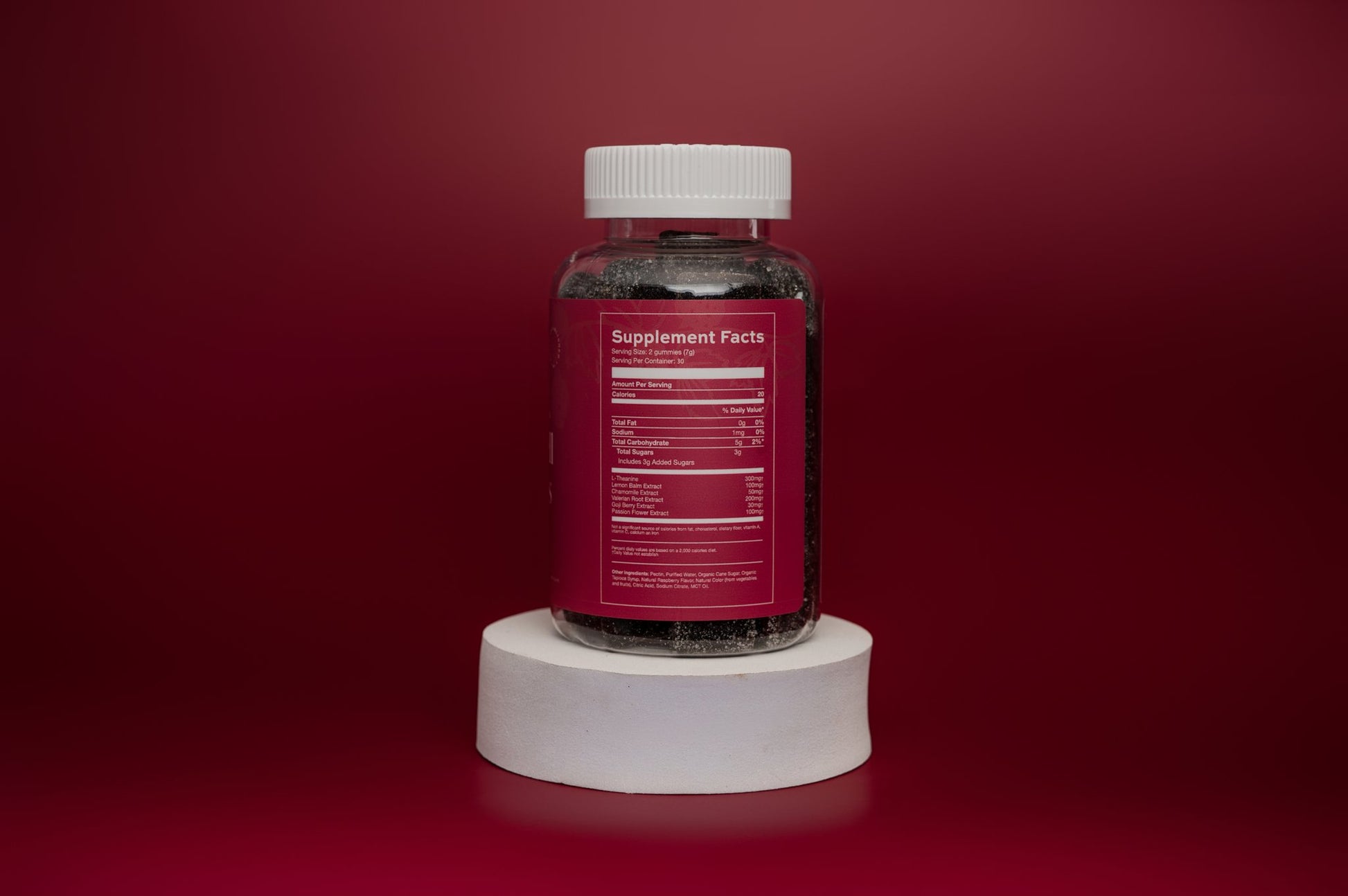 L-Theanine, Lemon Balm Extract, Chamomile Extract, Valerian Root Extract, Goji Berry Extract, Passion Flower ExtractPectin, Purified Water, Organic Sugar, Organic Tapioca, Organic Raspberry Flavor, Color (from Vegetables and Fruits), Citric Acid (Vitamin C), MCT oil