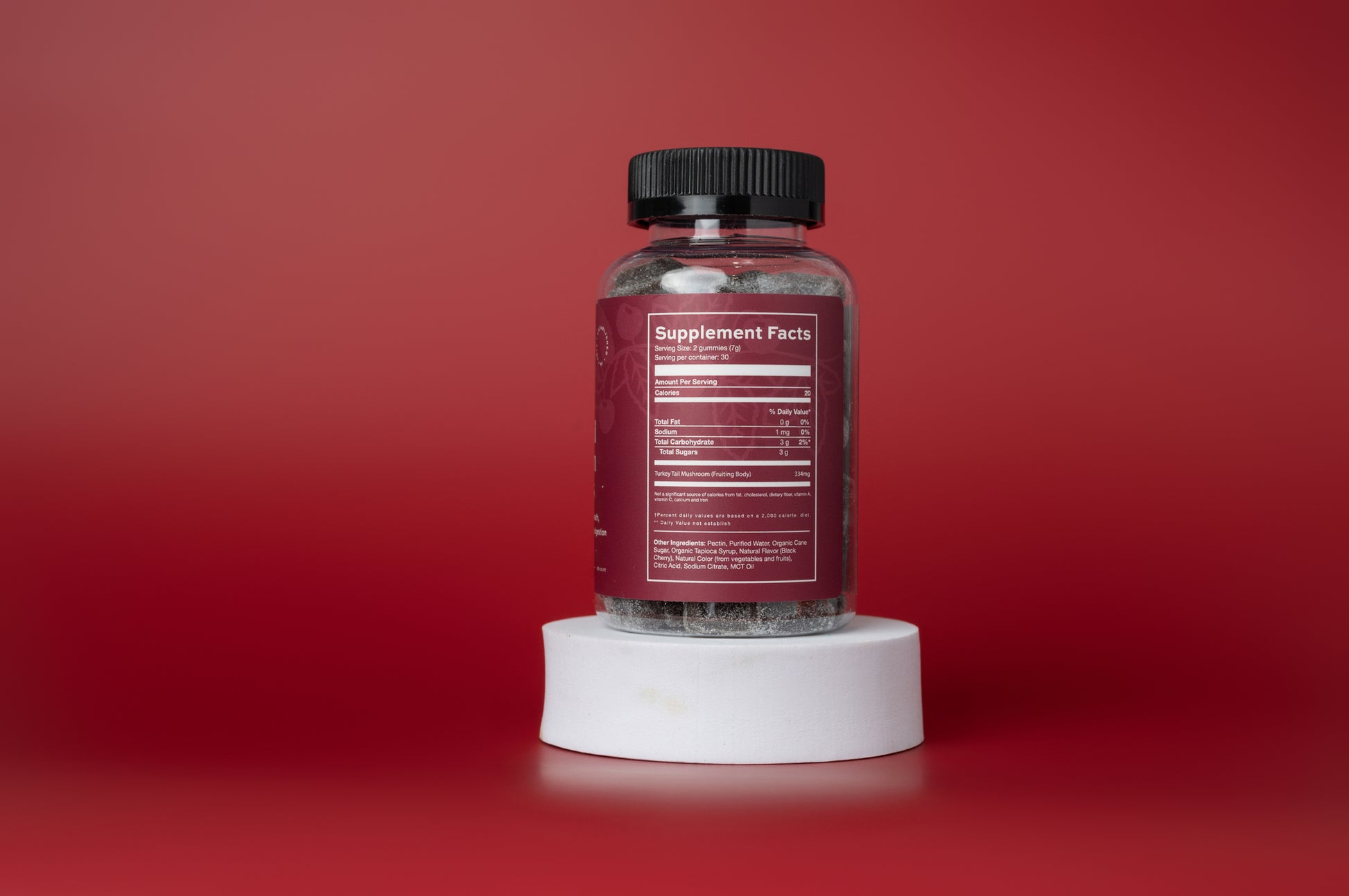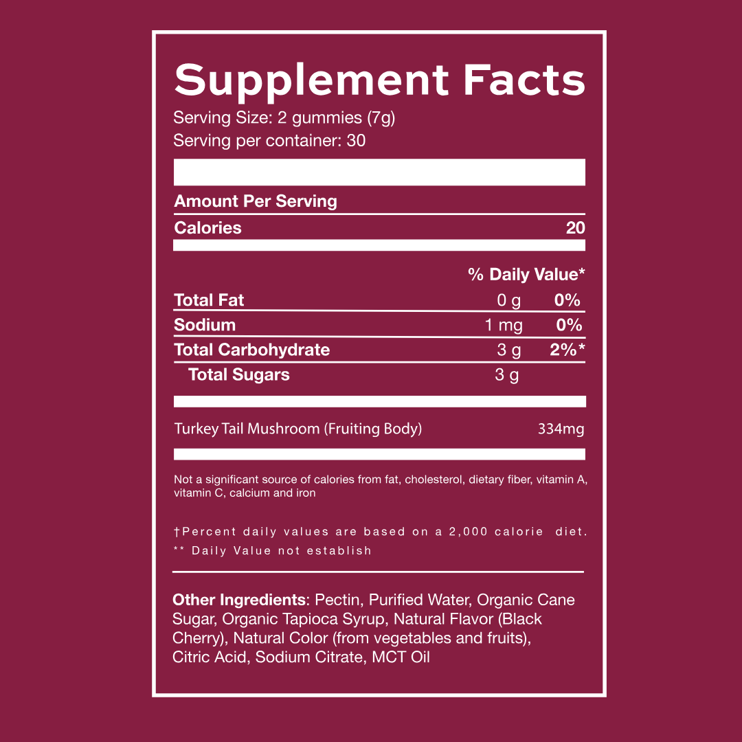 Turkey Tail Mushroom (Fruiting Body), Pectin, Purified Water, Organic Cane Sugar, Organic Tapioca Syrup, Natural Flavor (Black Cherry), Natural Color (from vegetables and fruits), Citric Acid, Sodium Citrate, MCT Oil
